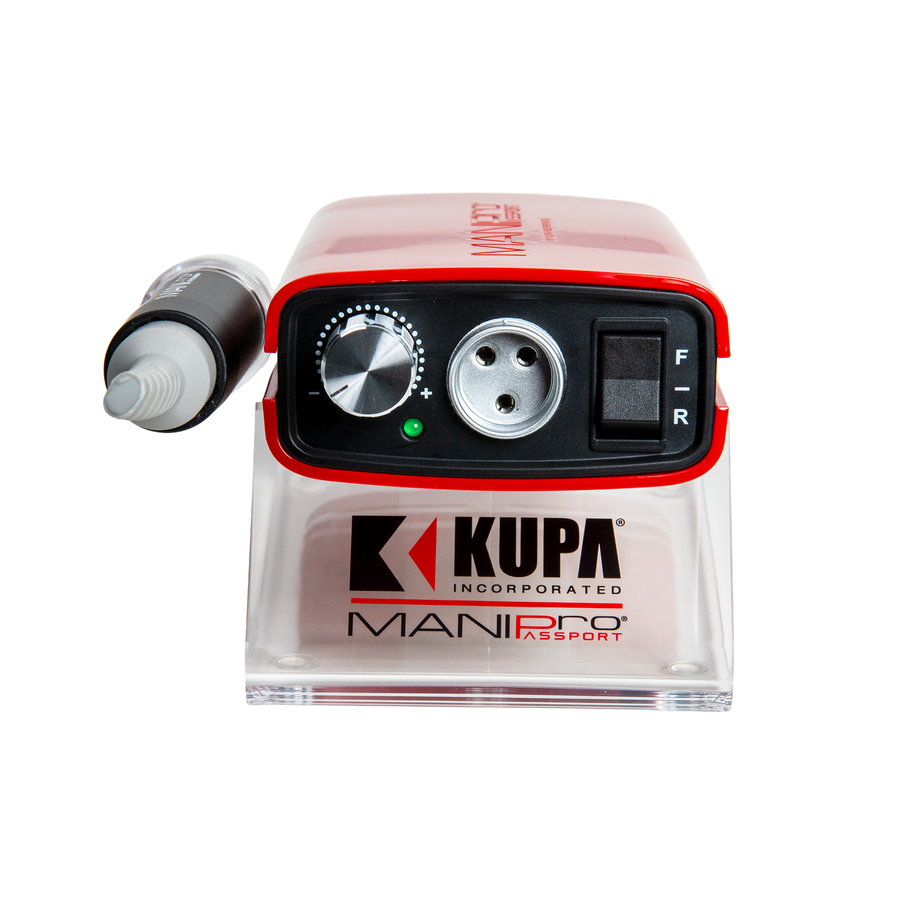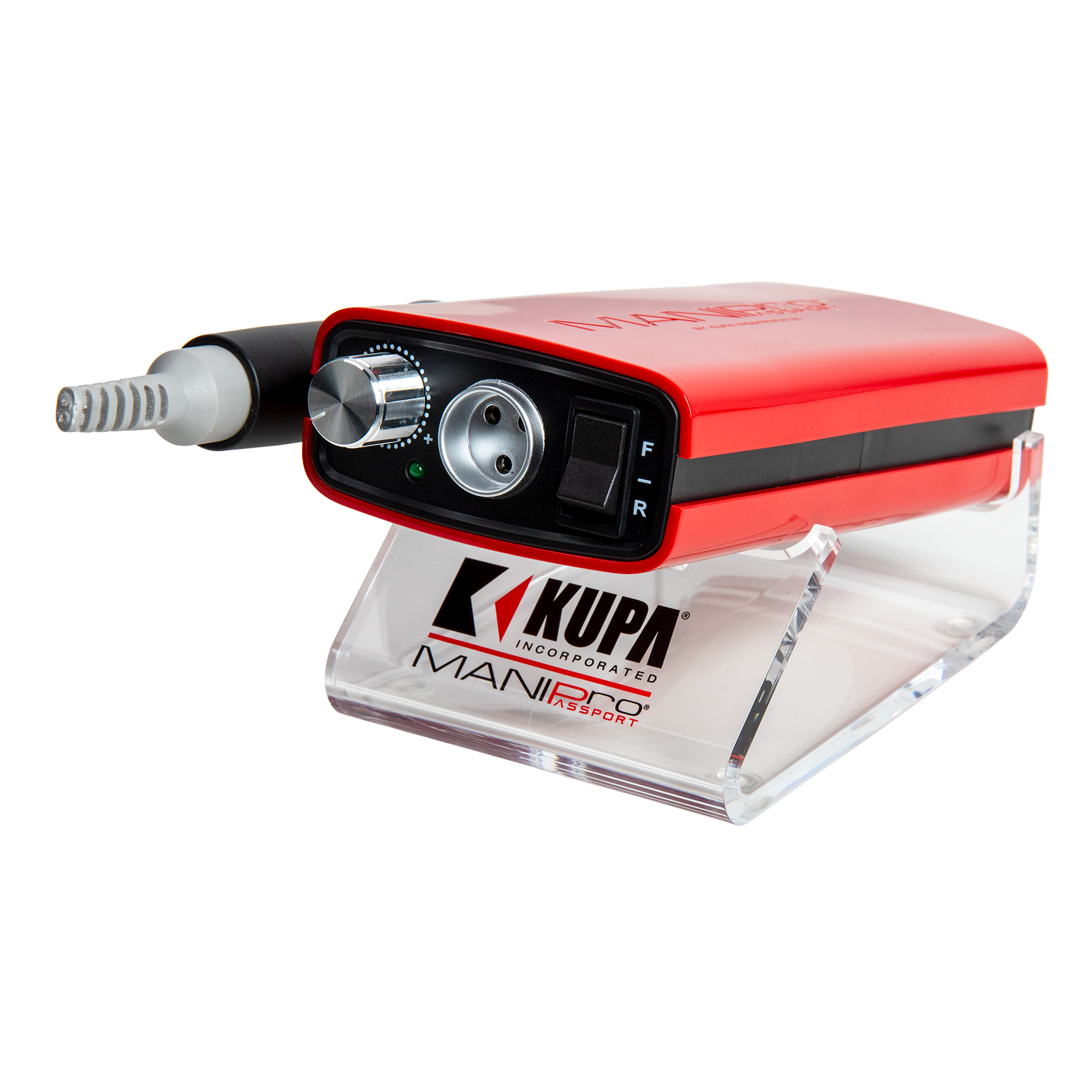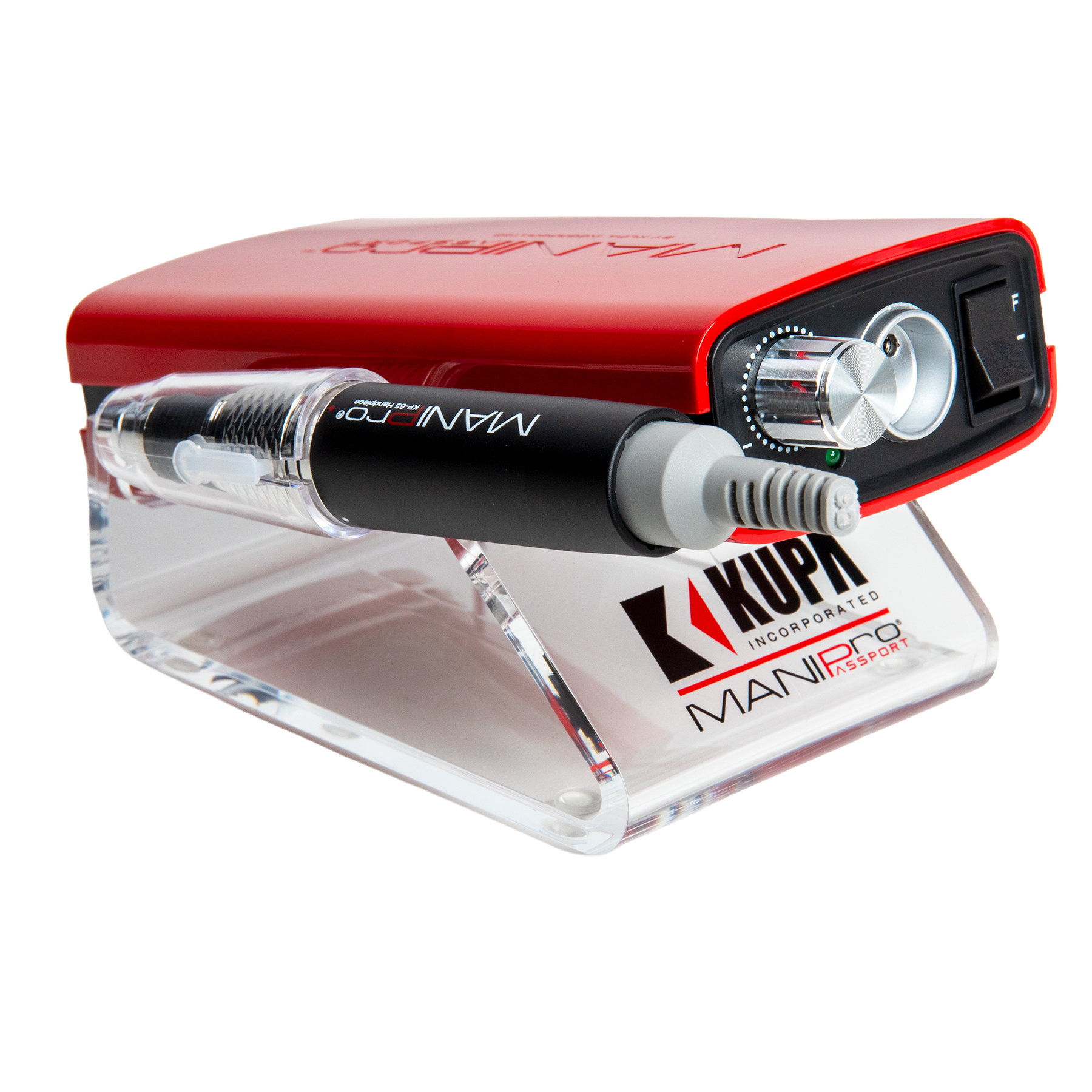 This powerful, all new exclusive, portable electric nail file has been designed for the Professional Nail Technicians who demand power and portability. The MANI-PRO Passport® Control Box features a light weight battery powered *Acetone Resistant Finish* control box. This unit can provide anywhere from 8 to 10 hours of use per charge in either 110v or 220v. The MANI-PRO Passport® comes complete with a stainless steel belt clip and a plastic handpiece holster which can snap on either side of the control box. Control box is available in Red or White. Full one year parts and labor warranty with your Kupa E-file Control Box!