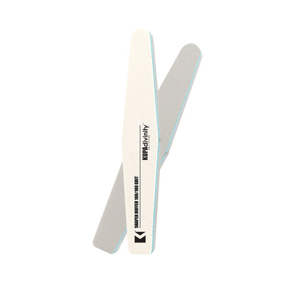 The Divinity Shaper Buffer file is a excellent tool for both shaping and forming your nails. With the white side 100 grit you can shape & from your nails as desired then flip the to the grey side to buff out any remaining scratches.