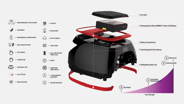 ¡La lámpara MANIPro GLO LED/UV es el accesorio de salón perfecto! ¡Combina tu lámpara con tu e-file o la estética de tu salón! ¡Esta es una lámpara alimentada por batería!