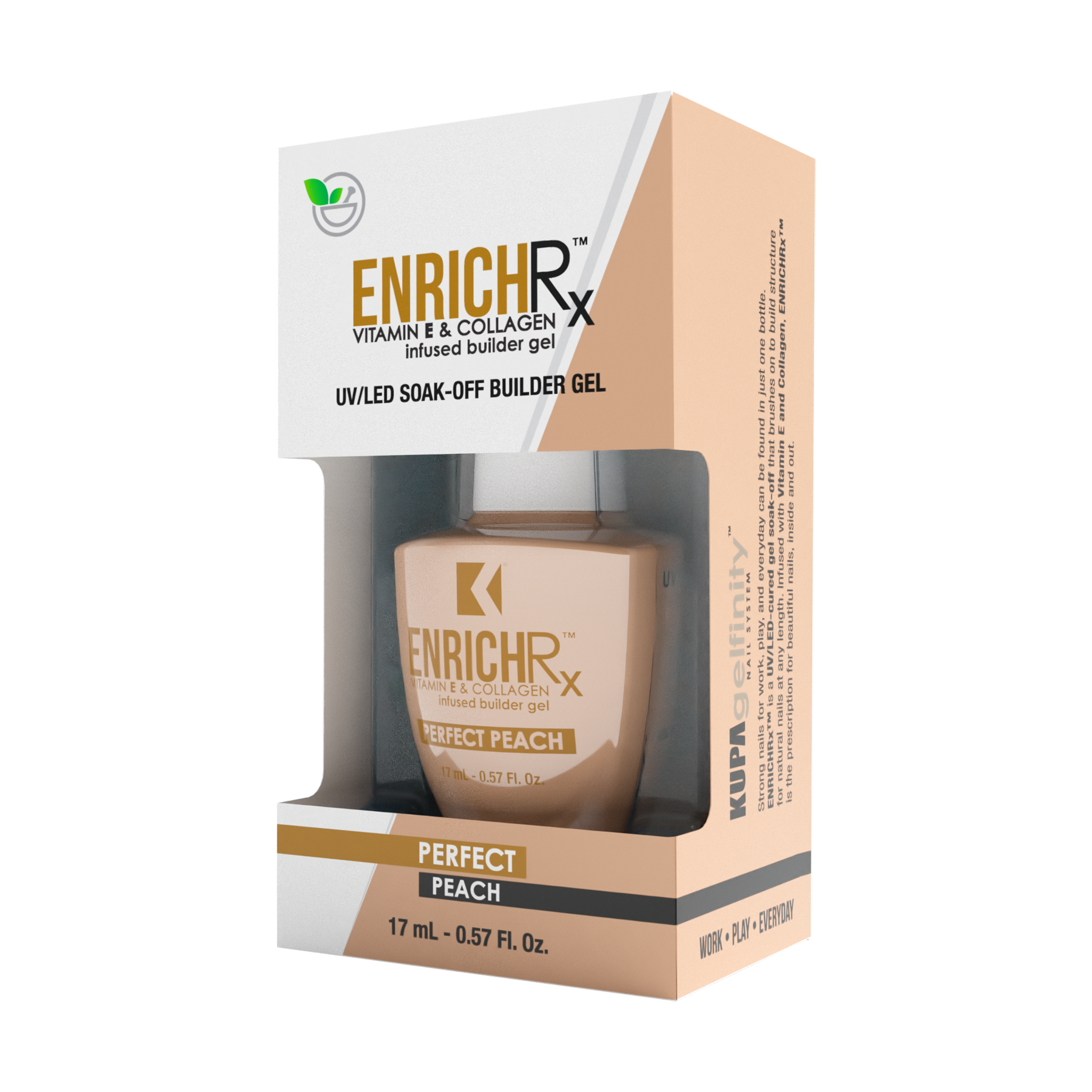 Uñas fuertes para el trabajo, el juego y todos los días se pueden encontrar en una sola botella. KUPA EnrichRx es un gel de remojo curado con UV/LED que se aplica con brocha para construir la estructura de las uñas naturales de cualquier longitud. Con una infusión de vitamina E y colágeno, EnrichRx es la receta para uñas hermosas, por dentro y por fuera.