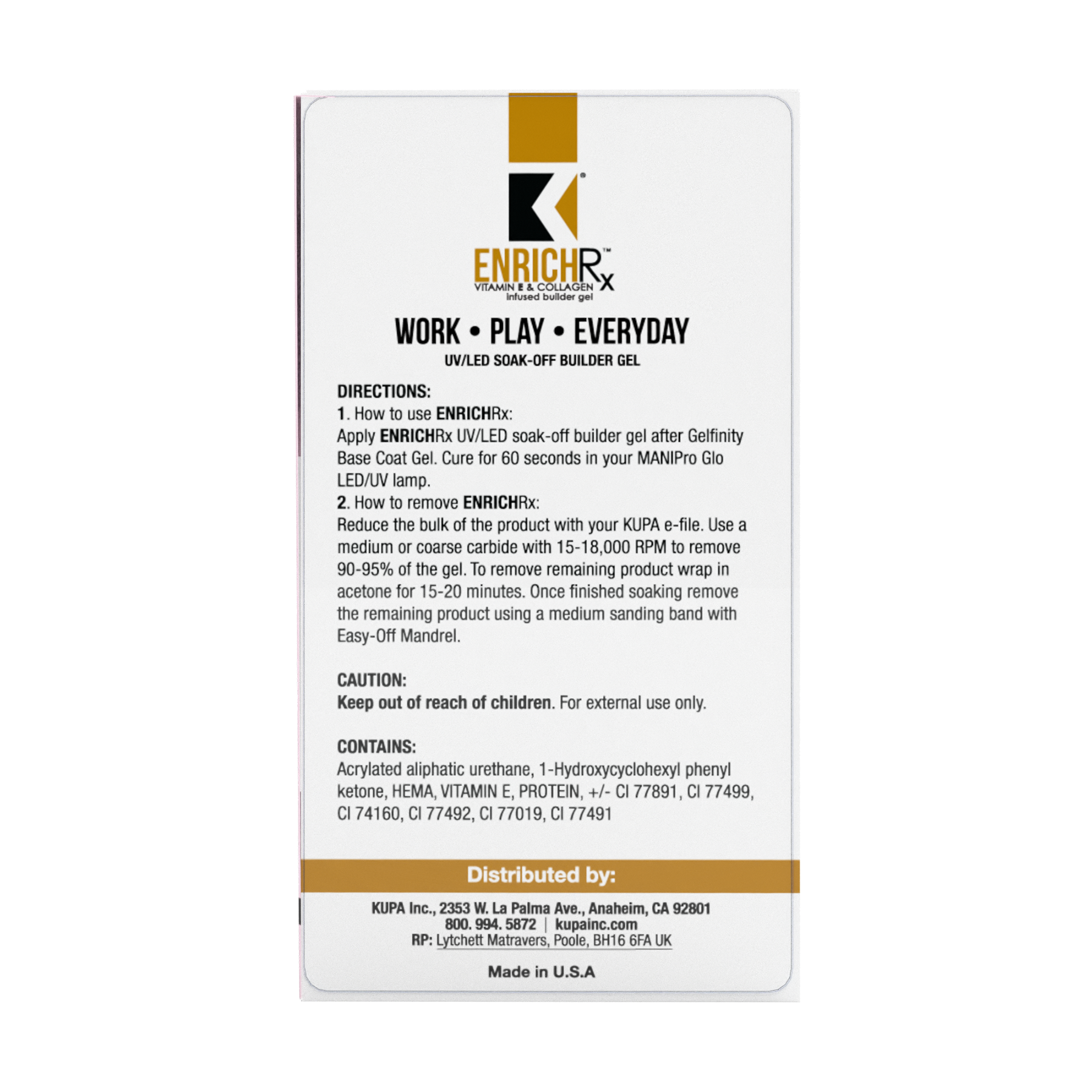 Apply ENRICHRx™ UV/LED soak-off builder gel after Gelfinity Base Coat gel. Cure for 60 seconds in your KUPA MANIPro Glo UV/LED Lamp Light or 90 seconds in a standard UV Light.