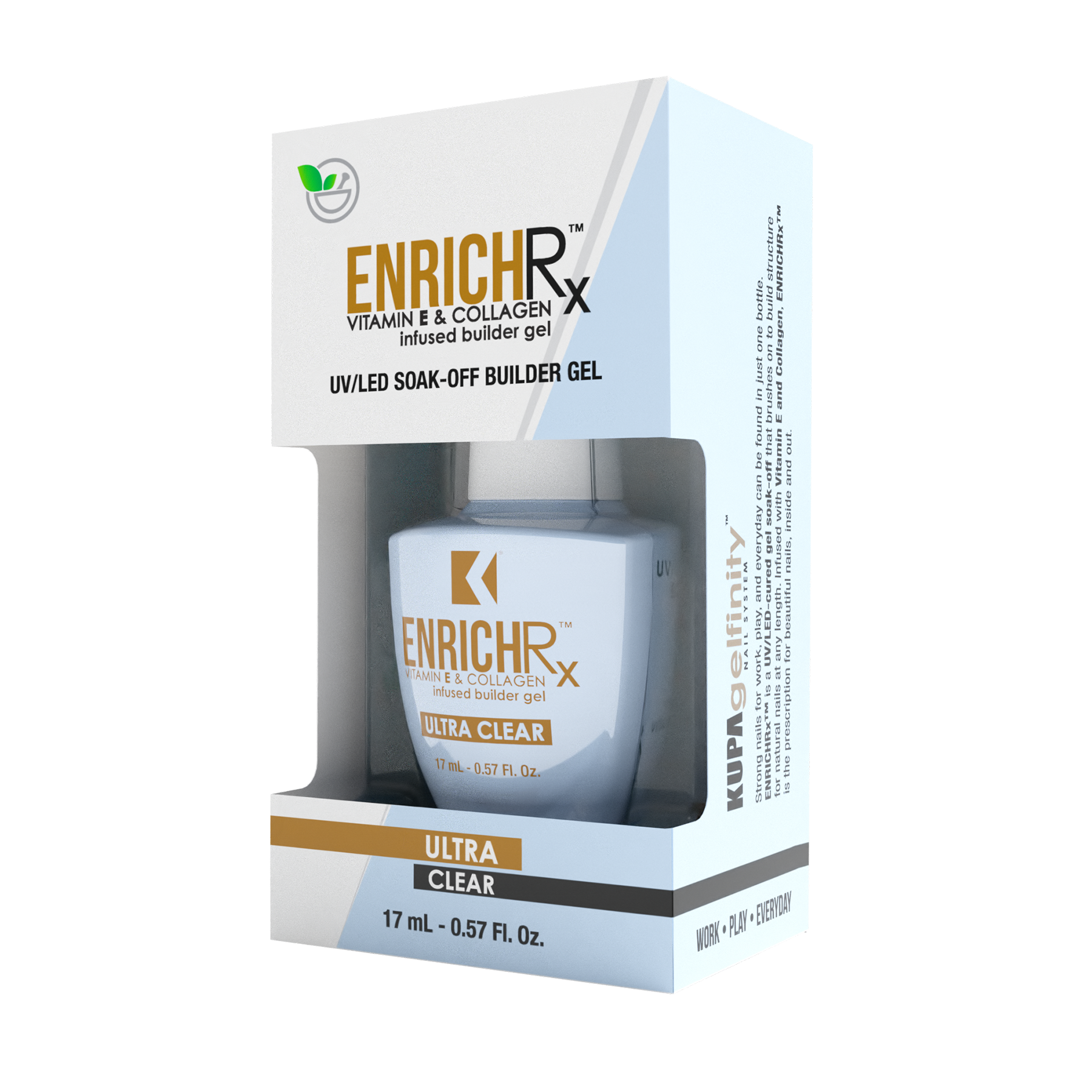 Strong nails for work, play, and everyday can be found in just one bottle. KUPA ENRICHRx™ is a UV/LED-cured soak-off gel that brushes on to build structure for natural nails at any length. Infused with Vitamin E and Collagen, ENRICHRx™ is the prescription for beautiful nails, inside and out.